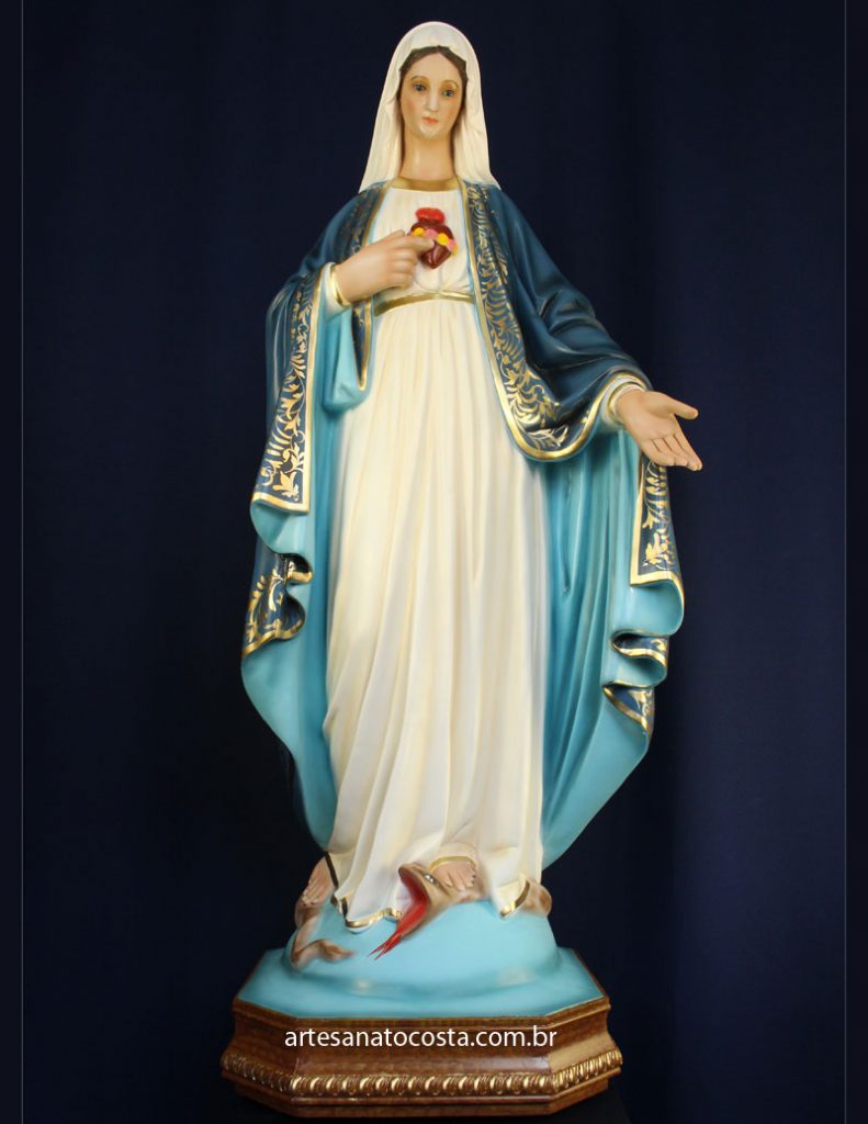 Imagem de Nossa Senhora Imaculado Coração de Maria (modelo mão esquerda abaixada) 100cm. Estátuas perfeitas, qualidade e alta resistência. Arte sacra, modelo de escultura católica exclusivo Artesanato Costa.